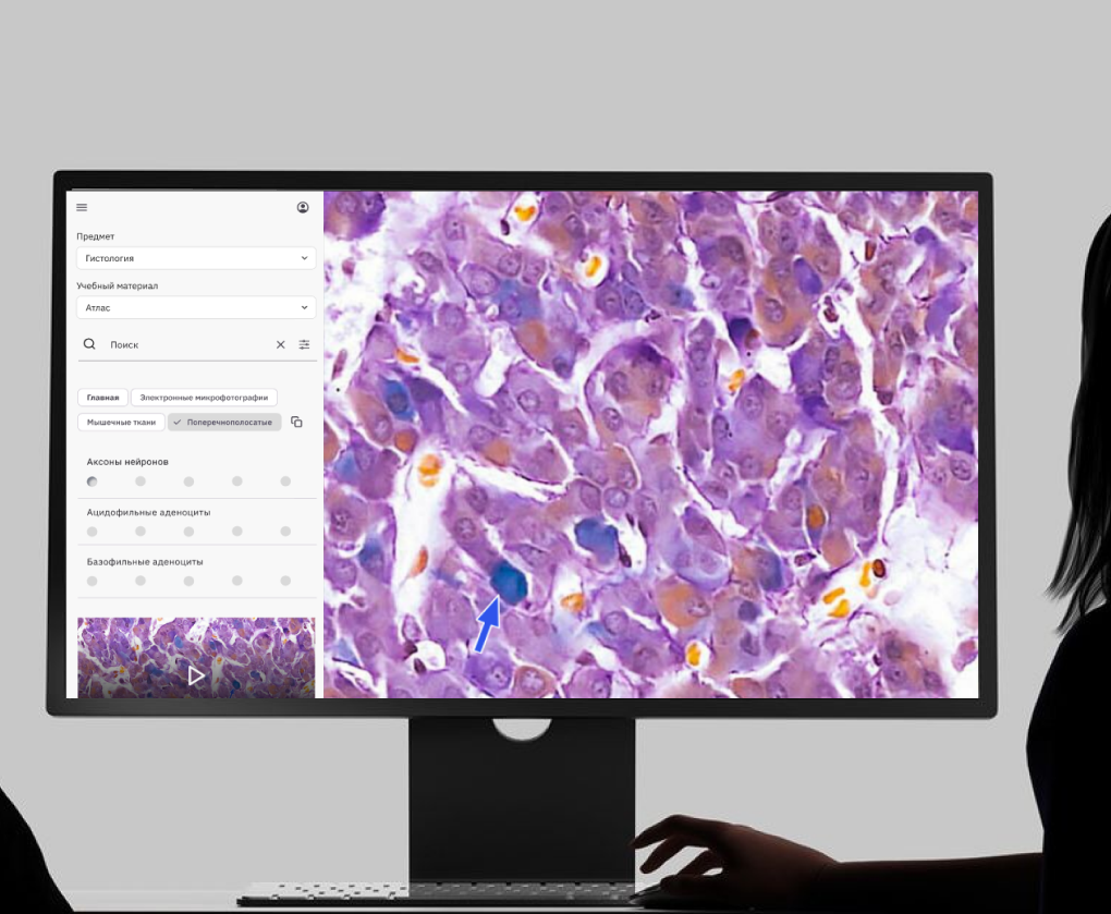 Препараты сопровождаются интерактивной разметкой, демонстрирующей структурные элементы, необходимые для изучения дисциплины, а также комментарии с их описанием